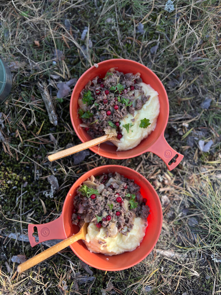När tjejerna hade bastat och badat i det kalla vattnet väntade tunnbrödswraps med viltskav, lingon och två sorters ostar. Till sist fick gästerna granskottspannacotta med vildhallon OCH granskott (som jag hade sparat i frysen).