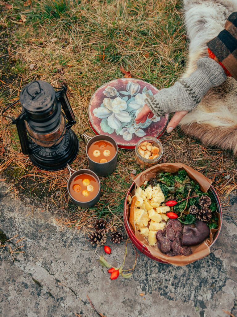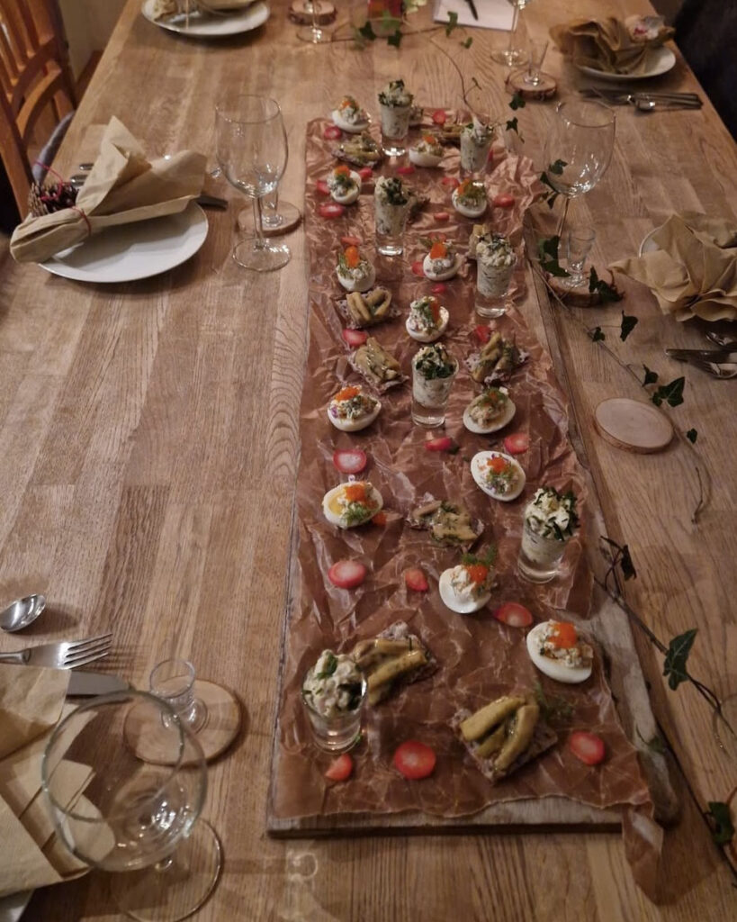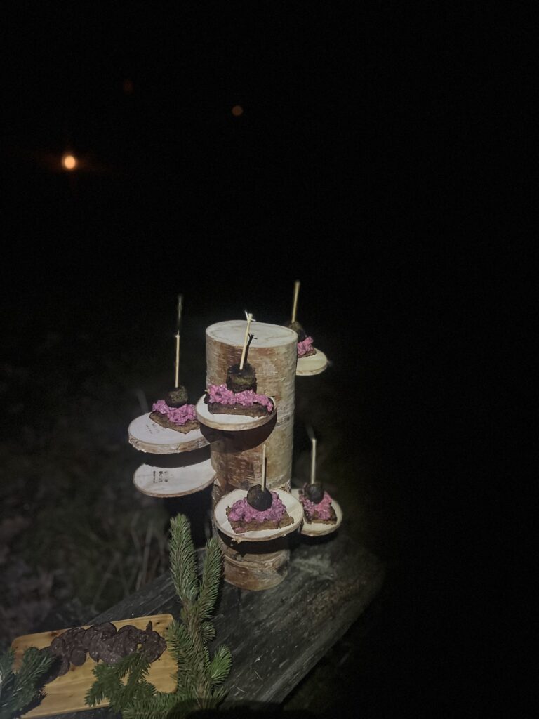 När en grupp workshoppande kvinnor frågade om jag kunde ordna en julmiddag på mitt sätt då fick jag verkligen leva ut mina drömmar. Maten och drycken var inspirerat av skog och naturen och många moment gjordes utomhus över eld, serverades på träbrickor och så vidare.