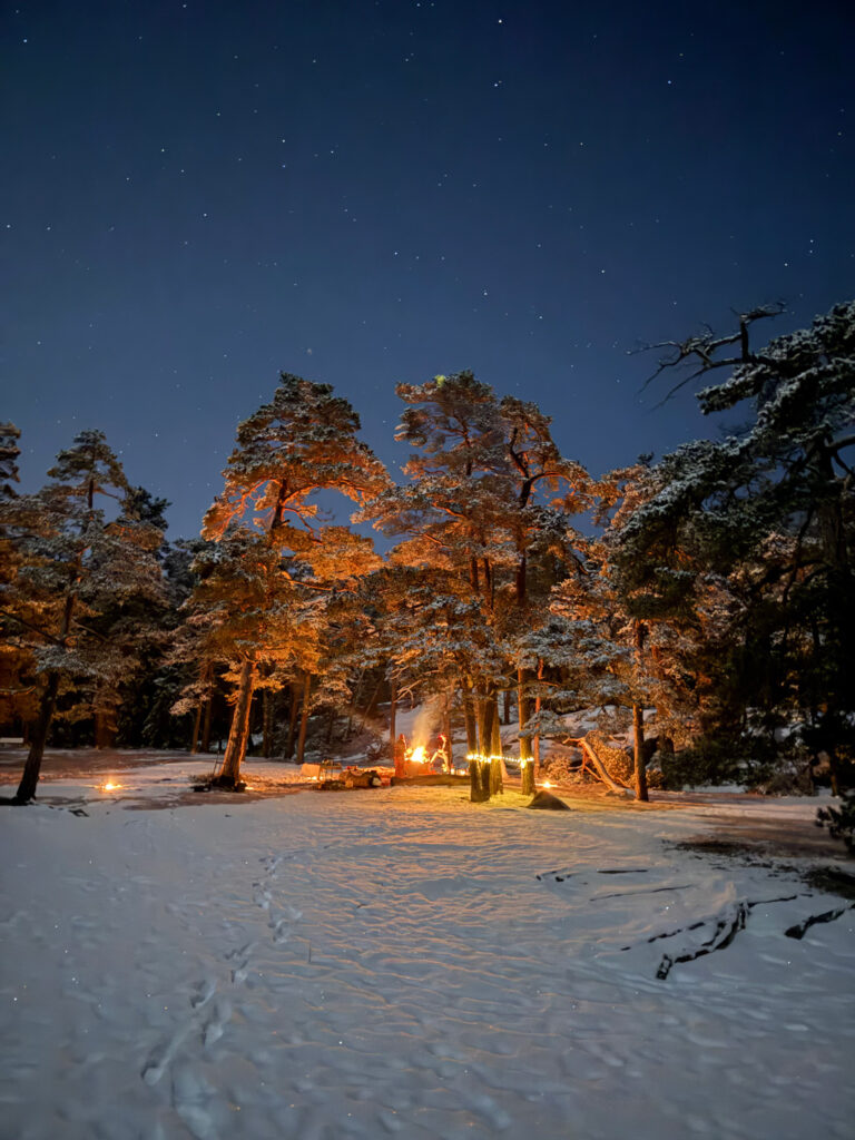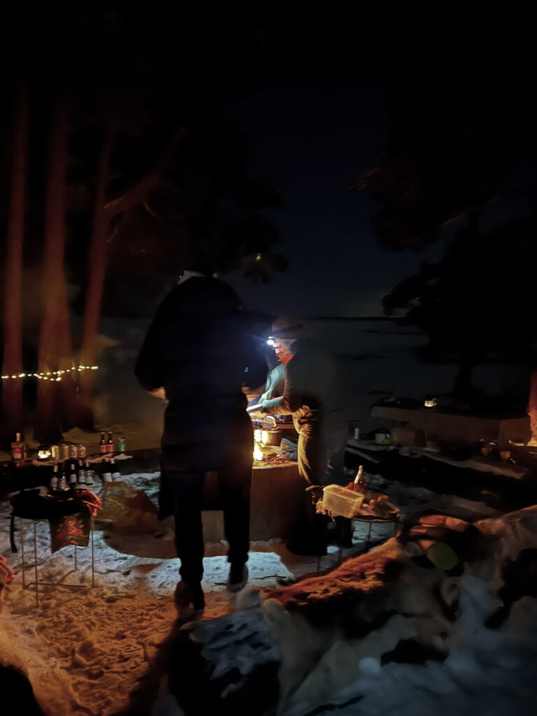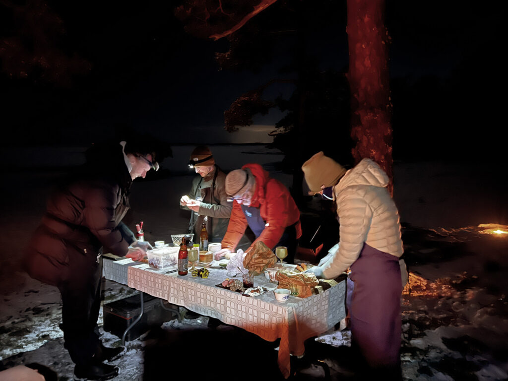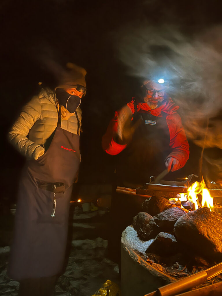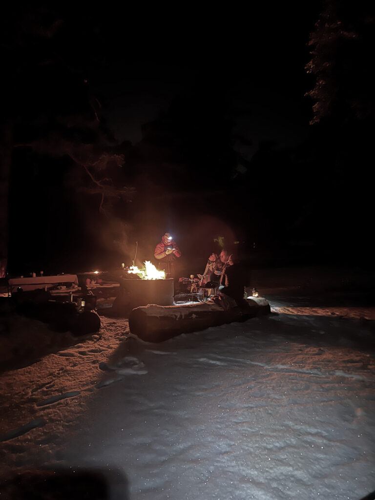 Ingen blir gladare än jag när jag får uppdrag som under vinterns mest krispiga kvällar. Jag får väl säga att det var rätt modigt av den här gruppen jurister från USA och Danmark som kom ut och lagade mat med mig under stjärnhimlen med pannlampor, eld och marshaller. Noctourism när den är som bäst, kallt, mörk och stjärnklart.